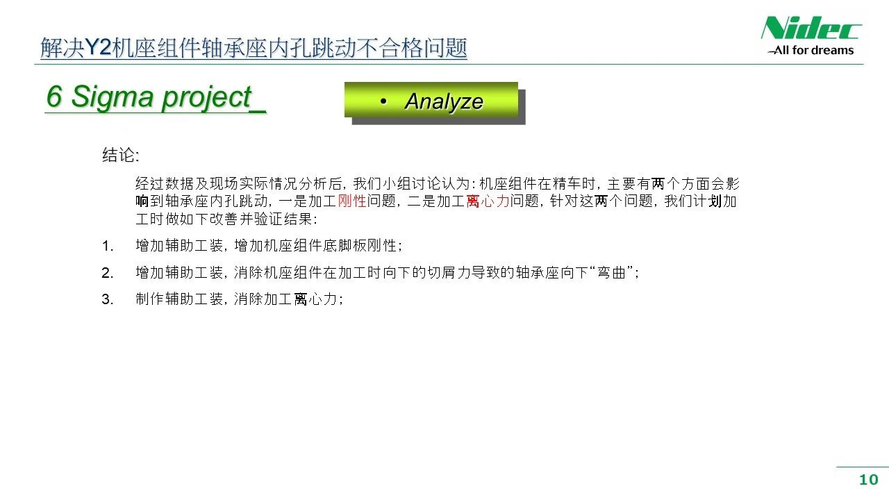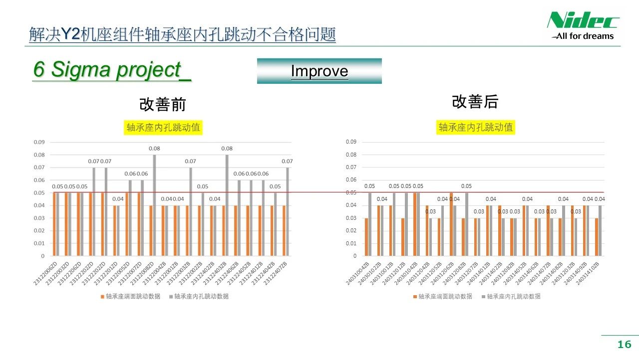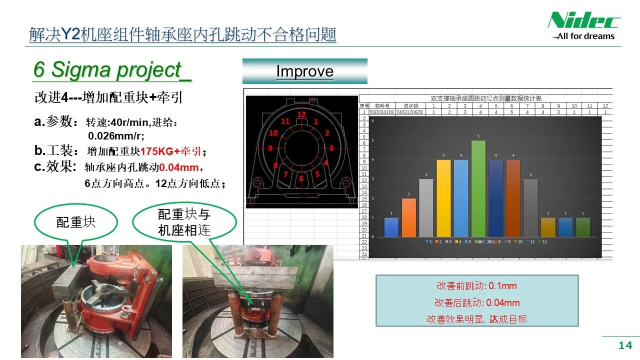 DMAIC উন্নতি প্রক্রিয়ার মধ্যে পাঁচটি পর্যায় রয়েছে: সংজ্ঞায়িত, পরিমাপ, বিশ্লেষণ, উন্নতি এবং নিয়ন্ত্রণ। এই পাঁচটি পর্যায় একটি পূর্ণ-প্রক্রিয়া গুণমান উন্নতির পদ্ধতি গঠন করে এবং প্রতিটি ধাপে বেশ কয়েকটি কাজের ধাপ রয়েছে। নিম্নলিখিত সমস্যাটির উন্নতির একটি সংক্ষিপ্ত বিবরণ দেওয়া হল যে সামনে এবং পিছনের ভারবহন চেম্বারের সমাহার এবং সমাবেশের শেষ মুখের রানআউট ডাবল-সমর্থিত মেশিন বেস এবং বিয়ারিং চেম্বার সমাবেশের পরে অস্থির হয়: