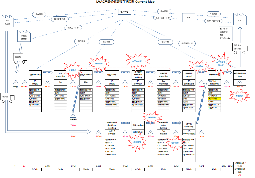 ভ্যালু স্ট্রীম ম্যাপ এবং মূল বিশ্লেষণ করা মেশিন মডেলের বর্তমান-স্থিতি মানচিত্র, সেইসাথে লীন ভ্যালু স্ট্রিমের ছয়টি নীতির সমন্বয় (প্রবাহ তৈরি করা, লিড টাইম সংক্ষিপ্ত করা, বর্জ্য হ্রাস করা, ইনভেন্টরি কম করা, কর্মীদের ব্যবহার উন্নত করা, এবং স্থানের ব্যবহার বাড়ানো), টিম VSM প্রাথমিক বিশ্লেষণের মাধ্যমে উন্নতির সুযোগ চিহ্নিত করেছে।