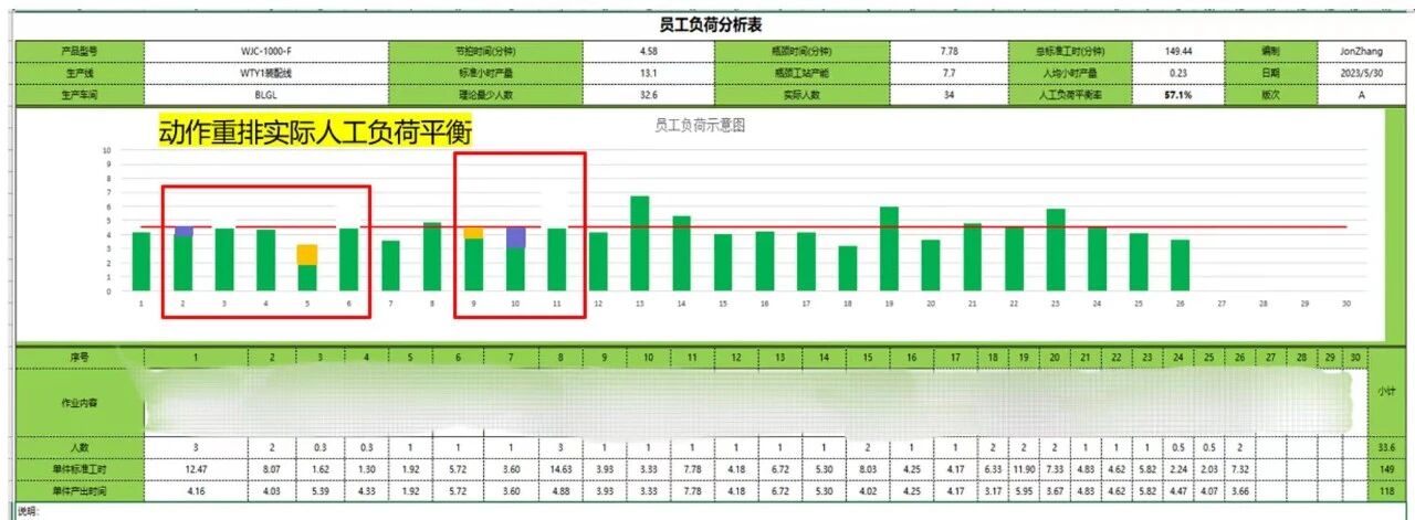 কর্মচারী কাজের চাপের হার ক্ষমতার উন্নতির একটি মৌলিক উপাদান। প্রক্রিয়াগুলির মধ্যে অসামঞ্জস্যপূর্ণ চক্র সময়ের কারণে, প্রকৃত আউটপুট তুলনামূলকভাবে কম ছিল। পূর্ববর্তী লাইন ব্যালেন্সিং উন্নতি থেকে সঞ্চিত অভিজ্ঞতা লাভ করে, ME বিভাগ উৎপাদন লাইন কর্মীদের কাজের চাপের ভারসাম্য হার বাড়ানোর জন্য ড্রাইভিং উদ্যোগে নেতৃত্ব দেয়। প্রক্রিয়াগুলি অপ্টিমাইজ করার জন্য ECRS নীতি (এলিমিনেট, একত্রিত, পুনর্বিন্যাস, সরলীকরণ) প্রয়োগ করে, কর্মচারী কাজের চাপের ভারসাম্য হার 82%-এর উপরে পৌঁছেছে।