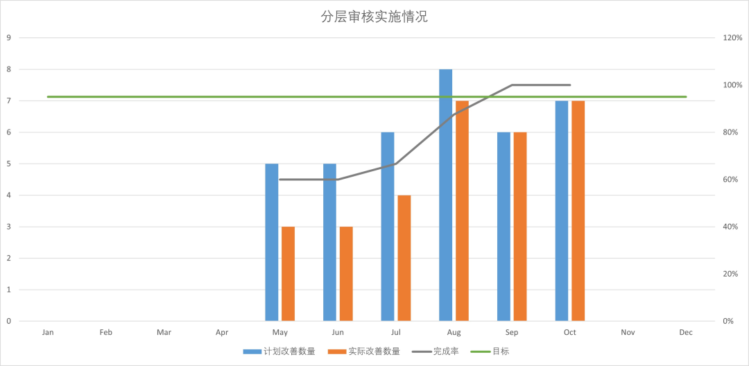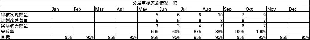 স্তরযুক্ত প্রক্রিয়া অডিটগুলির সামগ্রী বিস্তৃত। অডিটগুলির দক্ষতা এবং গুণমান পর্যবেক্ষণ করতে, এলপিএর প্রকৃত বাস্তবায়ন ড্যাশবোর্ডের অনুরূপ একটি উপায়ে প্রদর্শিত হয়। প্রদর্শিত সামগ্রীতে অন্তর্ভুক্ত রয়েছে: বাস্তবায়নের সমাপ্তির হার, নিরীক্ষণের অনুসন্ধানের সংখ্যা, উন্নতির সমাপ্তির হার ইত্যাদি etc.