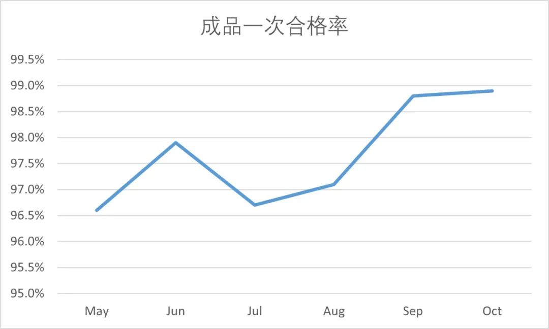 এই মানের মাসের উন্নতি উদ্যোগের বাস্তবায়নের মাধ্যমে, সমস্ত কর্মচারীর মান সচেতনতা উল্লেখযোগ্যভাবে বাড়ানো হয়েছে, এবং গুণমানের সূচকগুলি ব্যাপকভাবে উন্নত করা হয়েছে। বিশেষত, 5 এম 1 ই এর "ম্যান" ফ্যাক্টর সম্পর্কিত ত্রুটিগুলি উল্লেখযোগ্যভাবে হ্রাস পেয়েছে; অনুপস্থিত ইনস্টলেশন, ভুল ইনস্টলেশন এবং মিশ্র ইনস্টলেশন এর হার উল্লেখযোগ্যভাবে হ্রাস পেয়েছে; প্রাসঙ্গিক প্রক্রিয়াগুলিতে সম্ভাব্য মানের বিপদগুলি হ্রাস করা হয়েছে; এবং প্রক্রিয়াগুলির অপারেশনাল গুণমান ক্রমাগত অনুকূলিত করা হয়েছে। ফলস্বরূপ, প্রথম পাস ফলন এবং সমাপ্ত পণ্য প্রথম-পাস যোগ্যতার হার 1-2%বৃদ্ধি পেয়েছে, অন্যদিকে গ্রাহকের অভিযোগ এবং পণ্যের রিটার্ন উল্লেখযোগ্যভাবে হ্রাস পেয়েছে। ডেটাতে এই সুস্পষ্ট উন্নতিগুলি উন্নতি উদ্যোগের কার্যকারিতা এবং মানকে পুরোপুরি প্রদর্শন করে।