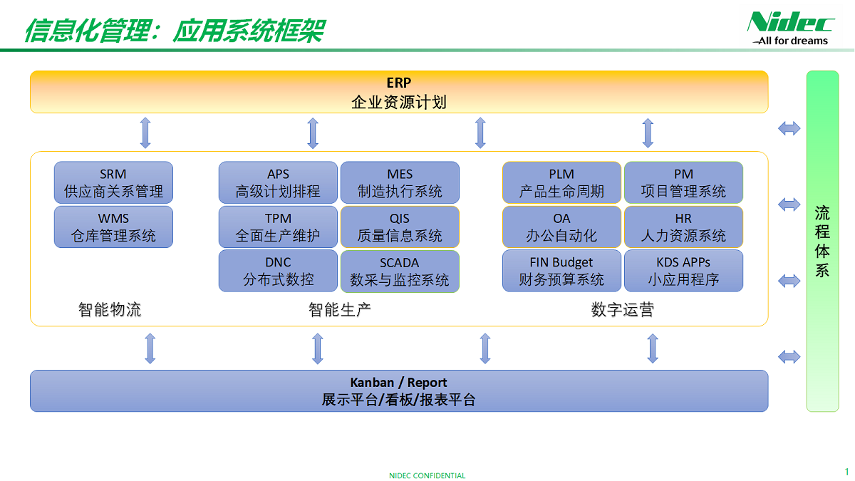 Nidec এলিভেটর মোটরস স্বাধীনভাবে SRM (সাপ্লাইয়ার রিলেশনশিপ ম্যানেজমেন্ট), MES (ম্যানুফ্যাকচারিং এক্সিকিউশন সিস্টেম), APS (অ্যাডভান্সড প্ল্যানিং অ্যান্ড শিডিউলিং), WMS (ওয়্যারহাউস ম্যানেজমেন্ট সিস্টেম), এবং TPM (টোটাল প্রোডাক্টিভ রক্ষণাবেক্ষণ) এর মতো সিস্টেম তৈরি করেছে। এটি অটোমেশন, ডিজিটালাইজেশন, মডেলিং, ভিজ্যুয়ালাইজেশন, ইন্টিগ্রেশন এবং বুদ্ধিমত্তার মাধ্যমে সম্পূর্ণ বুদ্ধিমান উৎপাদন ব্যবস্থা তৈরি করে, সুষম উৎপাদন সময়সূচী এবং নমনীয় স্মার্ট উত্পাদনের উপলব্ধিকে শক্তিশালী করে এবং একটি "বাতিঘর কারখানা" এর ভবিষ্যতের উপলব্ধির জন্য একটি শক্ত ভিত্তি স্থাপন করে।