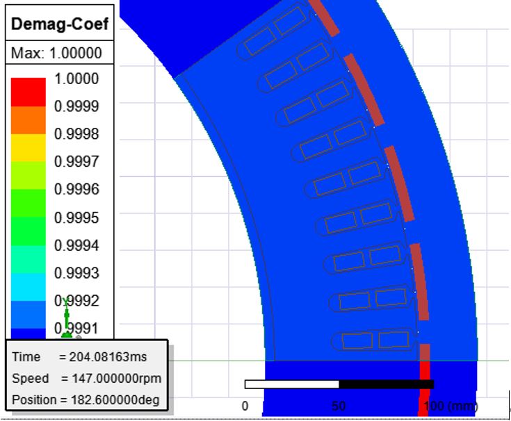 ট্র্যাকশন মেশিনগুলি সুরক্ষা-সমালোচনামূলক বিশেষ সরঞ্জাম এবং স্থায়ী চৌম্বক ডেমাগনেটাইজেশন তাদের কার্যকারিতা এবং নির্ভরযোগ্যতা প্রভাবিত করে এমন অন্যতম মূল কারণ। অপরিবর্তনীয় ডেমাগনেটাইজেশনকে অতিক্রম করার অনুমতি নেই। এই গবেষণাপত্রে, এএনএসওয়াইএস ম্যাক্সওয়েল সফ্টওয়্যার স্টার-সিলিং অবস্থায় শর্ট সার্কিট স্রোত দ্বারা প্ররোচিত বিপরীত চৌম্বকীয় ক্ষেত্রগুলির অধীনে স্থায়ী চৌম্বকগুলির ডেমাগনেটাইজেশন বৈশিষ্ট্যগুলি অনুকরণ করতে ব্যবহৃত হয়। বাতাসের বর্তমান প্রবণতা থেকে, বর্তমান শিখরটি তারকা-সিলিংয়ের মুহুর্তে 1000 এ ছাড়িয়ে গেছে এবং 6 বৈদ্যুতিক চক্রের পরে স্থিতিশীল হয়। ম্যাক্সওয়েল সফ্টওয়্যারটিতে ডেমাগনেটাইজেশন হার তাদের মূল অবশিষ্টাংশের চৌম্বকীয়তার সাথে ডেমাগনেটাইজিং ক্ষেত্রের সংস্পর্শের পরে স্থায়ী চৌম্বকগুলির অবশিষ্ট চৌম্বকীয়তার অনুপাতকে উপস্থাপন করে; 1 এর একটি মান কোনও ডেমাগনেটাইজেশন নির্দেশ করে না এবং 0 সম্পূর্ণ ডেমাগনেটাইজেশন নির্দেশ করে। ডেমাগনেটাইজেশন কার্ভস এবং কনট্যুর মানচিত্র থেকে, স্থায়ী চৌম্বক ডেমাগনেটাইজেশন হার 1, কোনও ডেমাগনেটাইজেশন পর্যবেক্ষণ করা হয়নি, এটি নিশ্চিত করে যে সিমুলেটেড ট্র্যাকশন মেশিন নির্ভরযোগ্যতার প্রয়োজনীয়তা পূরণ করে।